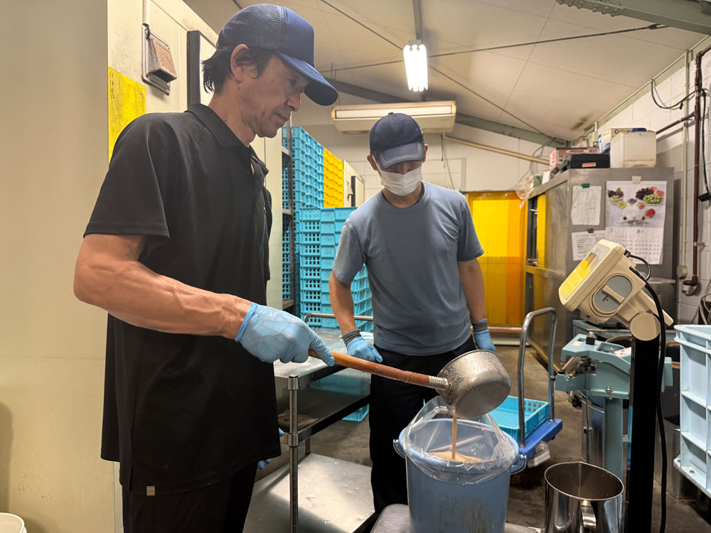 攪拌してできたラーメンスープを充填していきます。ラーメン屋さんのご要望に合わせて5キロパック、10キロパックという感じでオリジナルでご対応させていただきます。基本はお店で使うように1キロからパッキングすることができます。